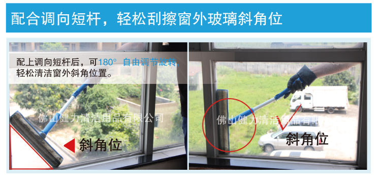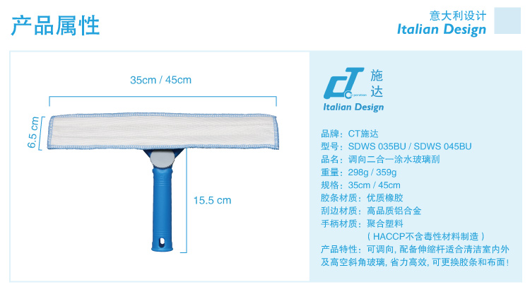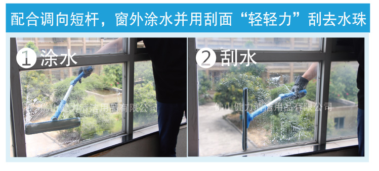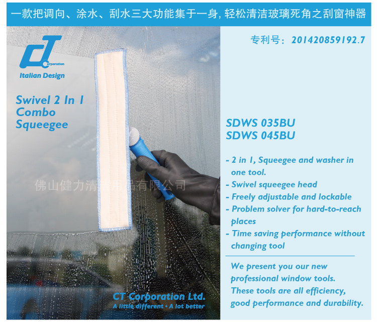 还在为清洁不到玻璃斜角、死角而沮丧?还在为涂水刮水需要不同工具不同工序而烦恼?没关系,CT施达调向双面玻璃刮来帮您! 施达创新专利玻璃刮把调向、涂水、刮水三大功能集于一身,让玻璃清洁轻松高效无死角。