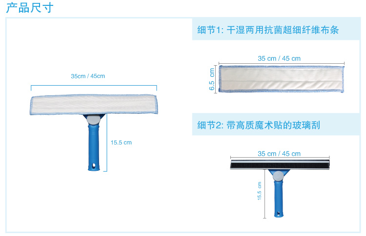 贯彻绿色环保清洁概念;胶条、魔术贴、清洁布、铝合金条及调向手柄等各个配件均可轻松更换,同时可以匹配一杆通用的快接铝杆,大大减低使用成本。