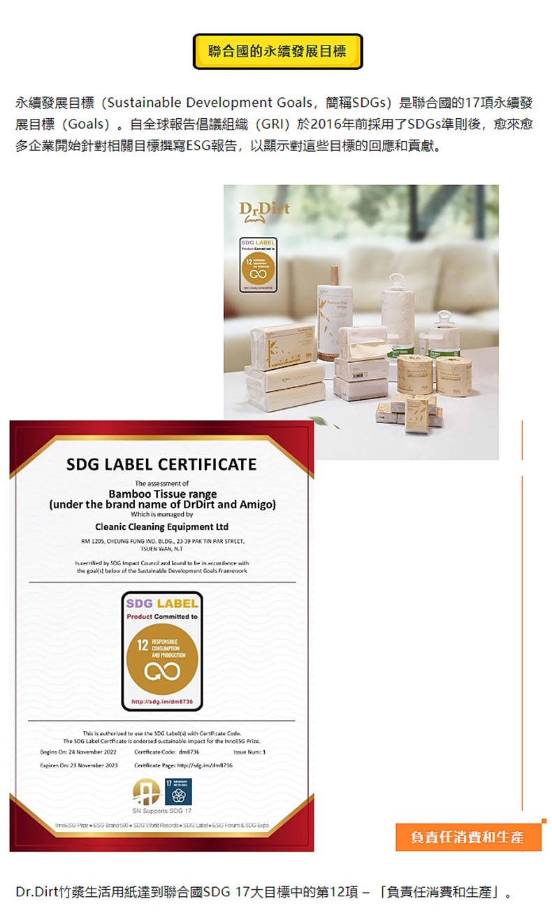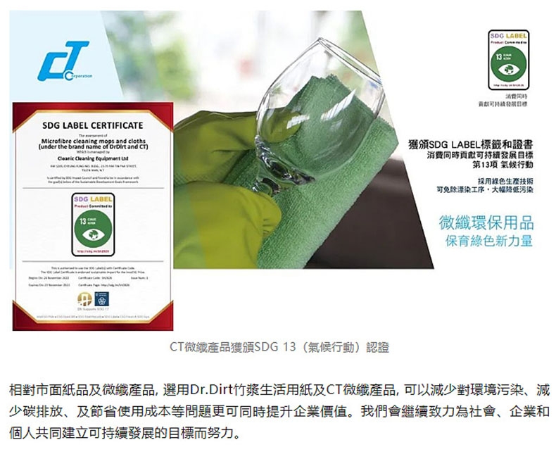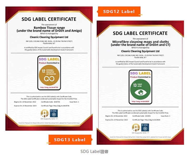 健力集团已于2023年获得SDG 12项 及SDG 13项环保认证。施达公司作为健力集团的一份子,与集团同心协力,不遗余力地推动清洁行业的ESG理念完善及探索实践,为可持续发展做出新贡献。