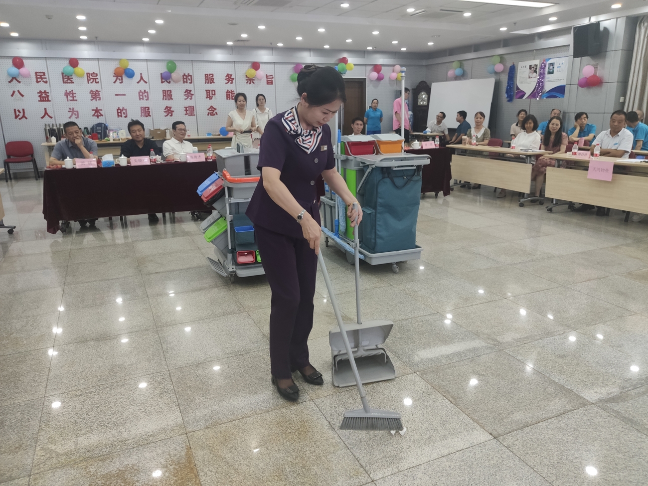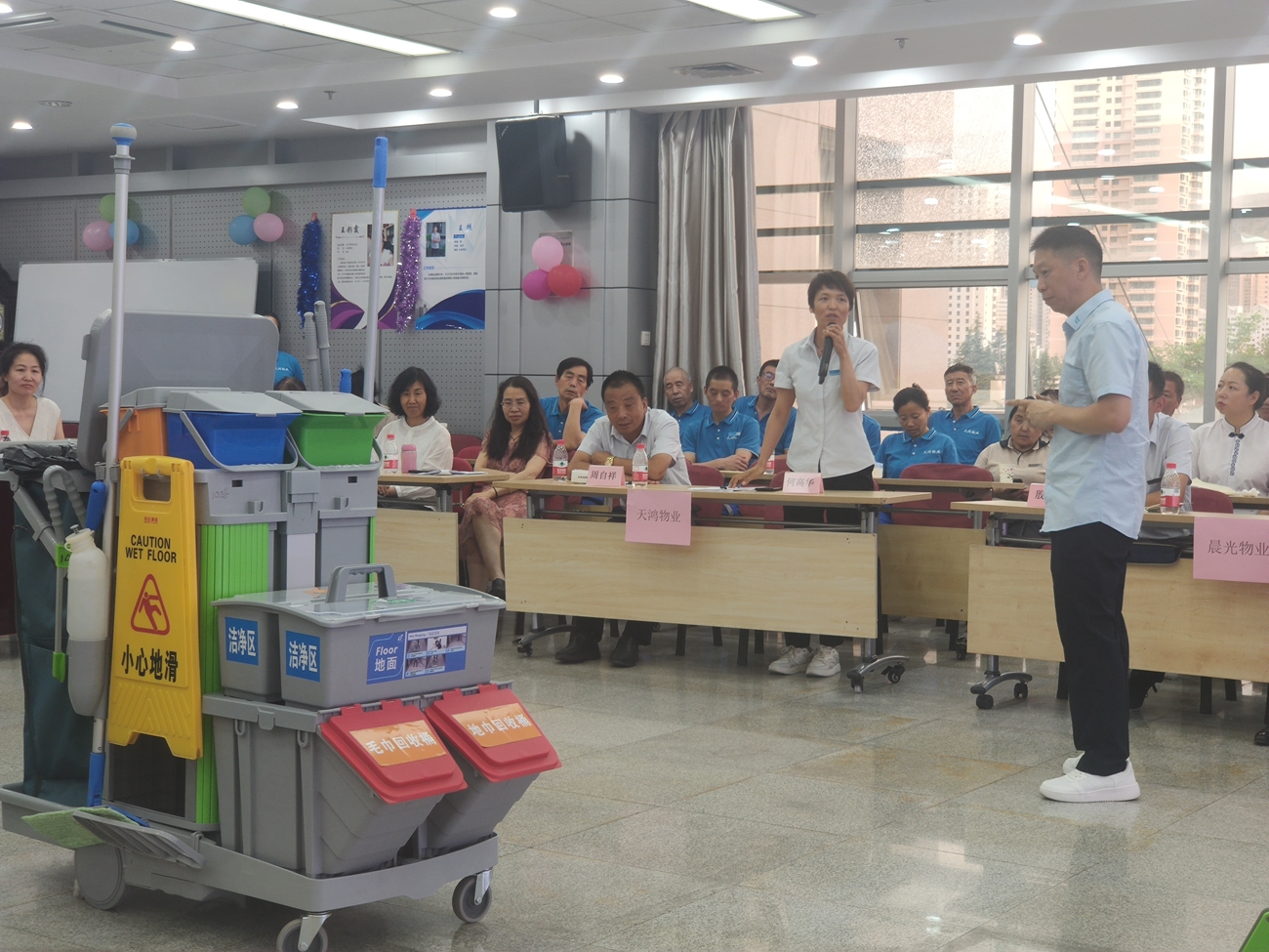 会上周经理积极与一线的保洁人员交流分享关于绿色环保清洁标准化的理念与操作层面的流程方法。
