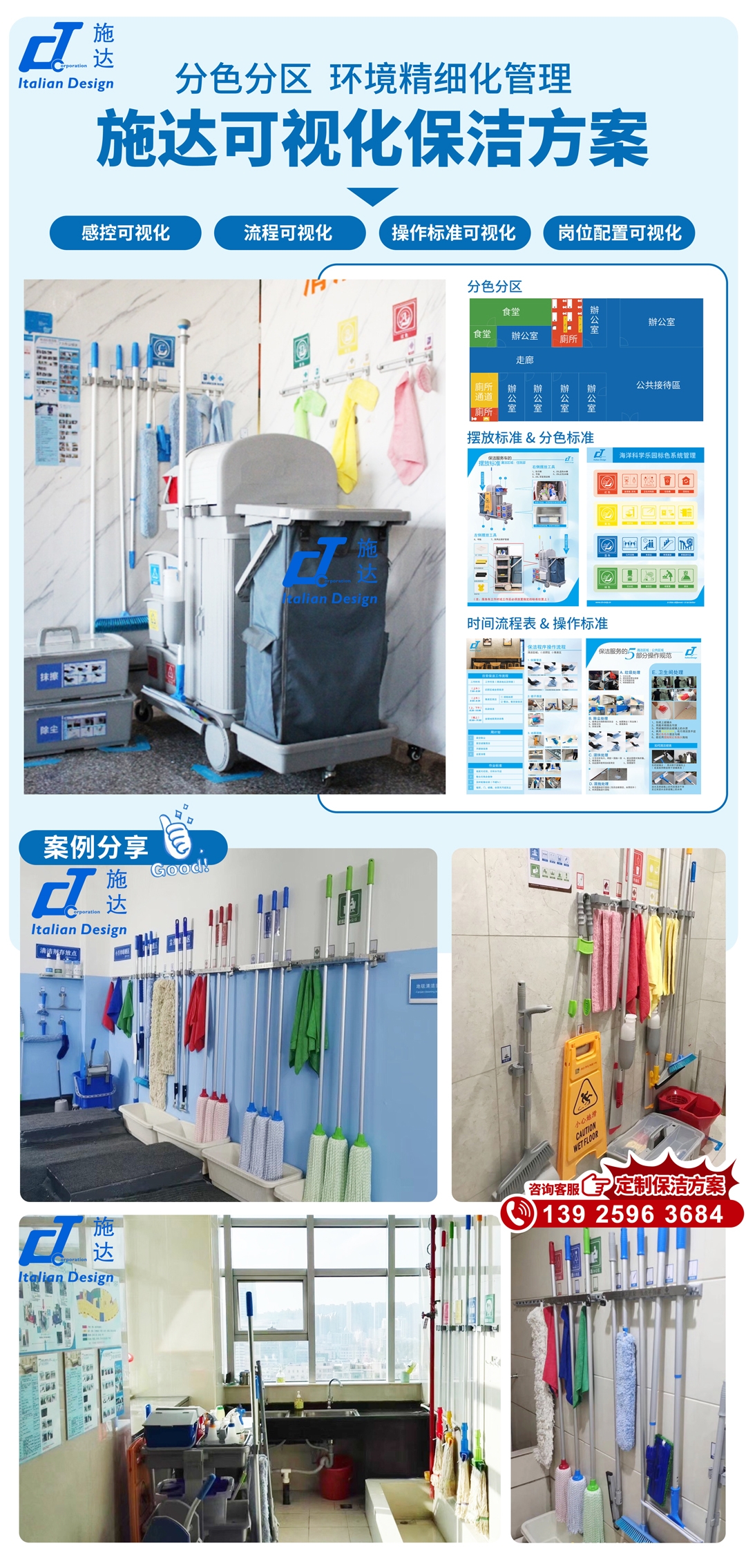 保洁员们熟练地展示如何使用施达的环保清洁标准化工具。