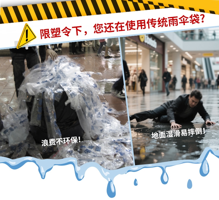 限塑令都推行好久啦,不会还有人在用传统雨伞袋吧?每次用完就扔,给环境添了多少负担呀!同时湿滑的地面很容易引发摔倒等危险!
