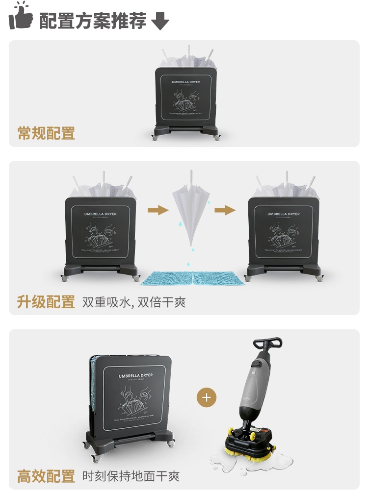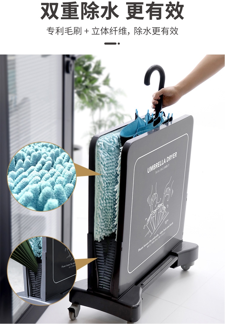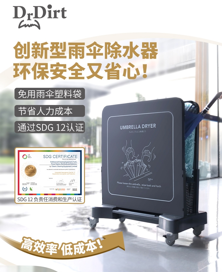 是时候试试 Dr.Dirt 全新推出的环保雨伞除水器了!把湿哒哒的雨伞放进去,再来回摇动雨伞,这样大部分水就被吸水布吸走,除水效率杠杠的,效果好。而且它成本低,非常适合商场、酒店、学校、等场所使用。