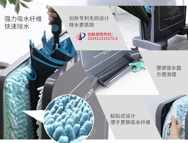 高效除水:拥有创新专利毛刷设计,搭配强力吸水纤维,除水快速又高效,且成本低。轻轻来回摆动,就能让雨伞迅速干爽 ,再也不用担心水滴弄湿地面。而且吸水纤维粘贴式设计,更换很方便!