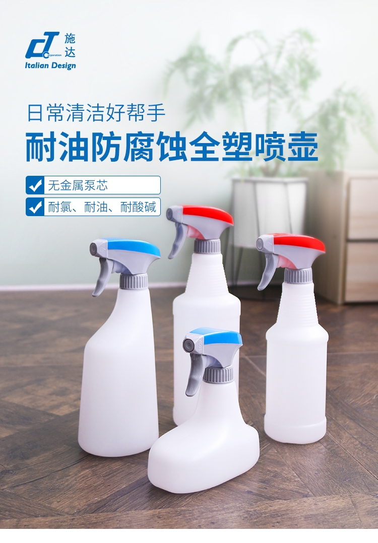 全塑胶喷壶凭借无金属泵芯和全新PP材质,实现对酸、碱、油、氯的全面耐受,为腐蚀性清洁提供安全可靠的解决方案。