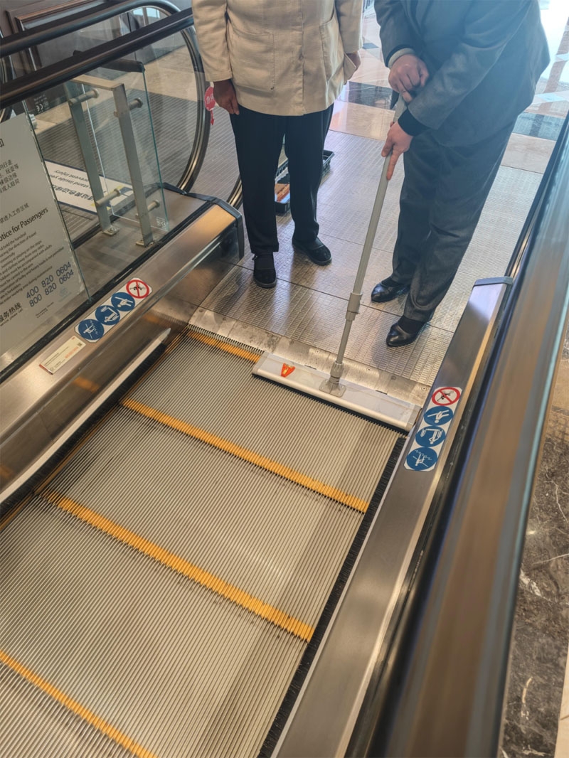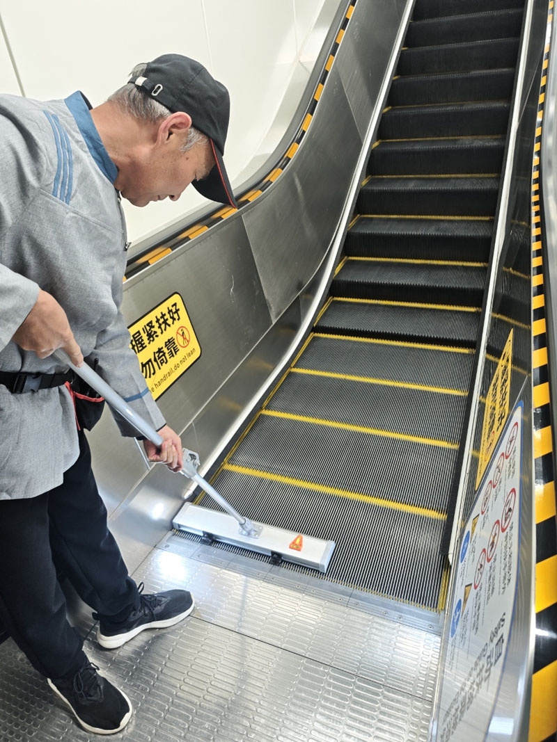 健力集团于2025年11月到济南某大型交通枢纽站及五星级酒店等保洁项目进行扶梯清洁现场培训,使用“新一代施达扶梯清洗工具”进行实地清洁。