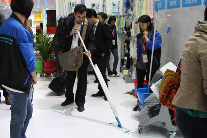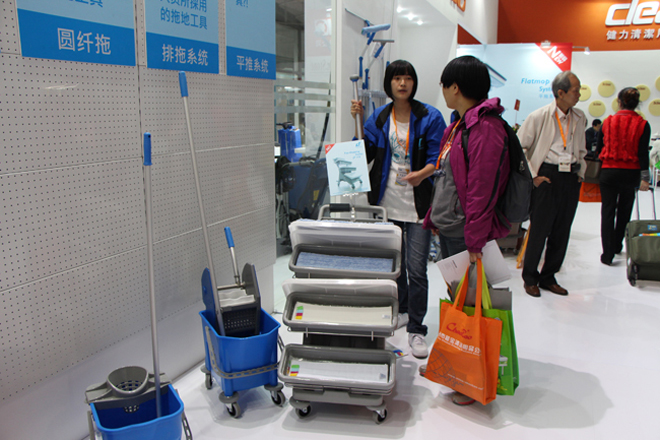 客户对施达CT新款平拖系统产生浓厚兴趣,并询问实际使用情况。