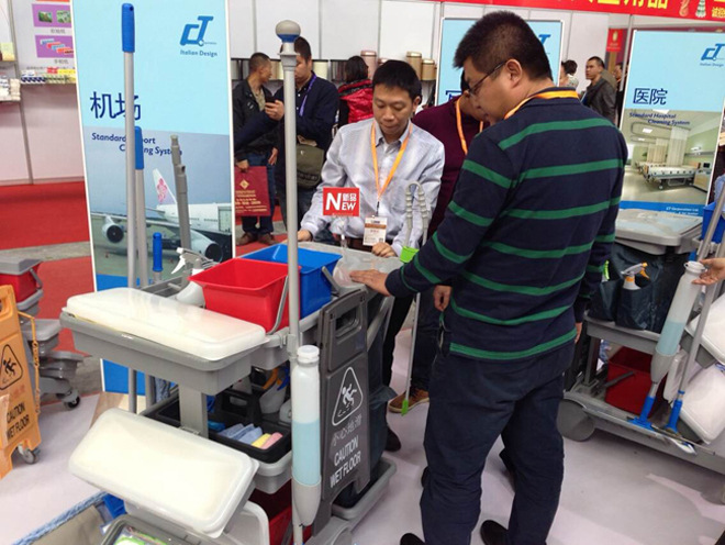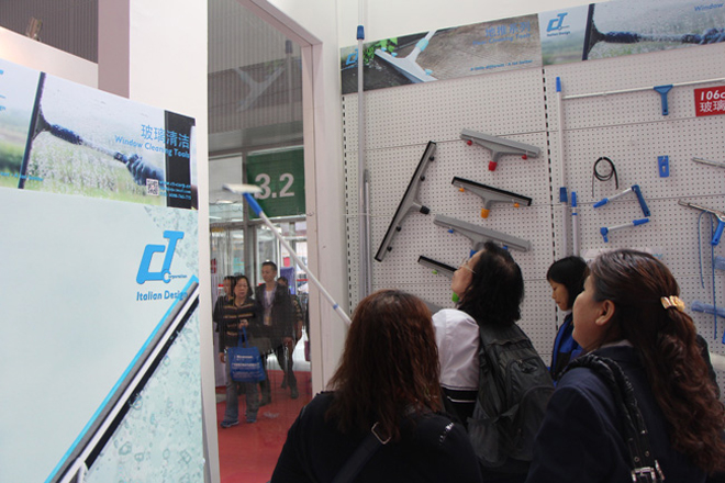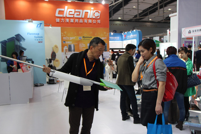 健力集团执行董事吴永新在现场展示新品喷洒平拖的功能