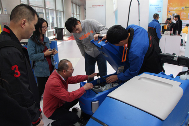 健力公司技术部欧先生在展场解说洗地机的使用功能
