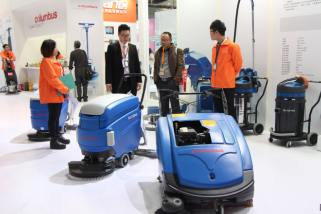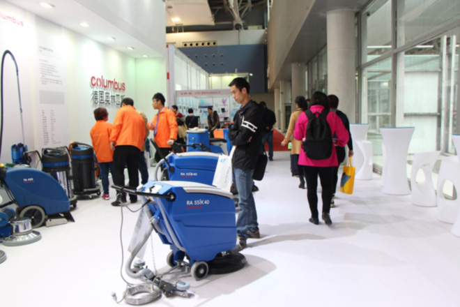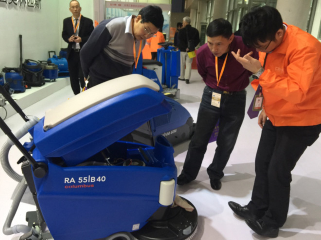 此次展示的新品之一:卷帘式储物箱及灵巧型喷洒平拖SME 50,配合施达服务车能将卫生清洁及安全管理推向更高领域
