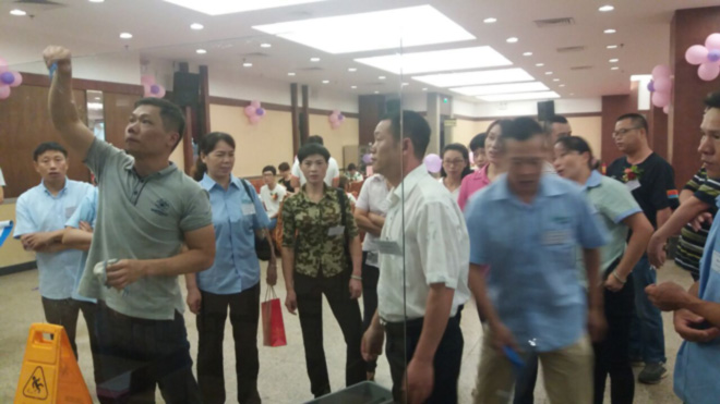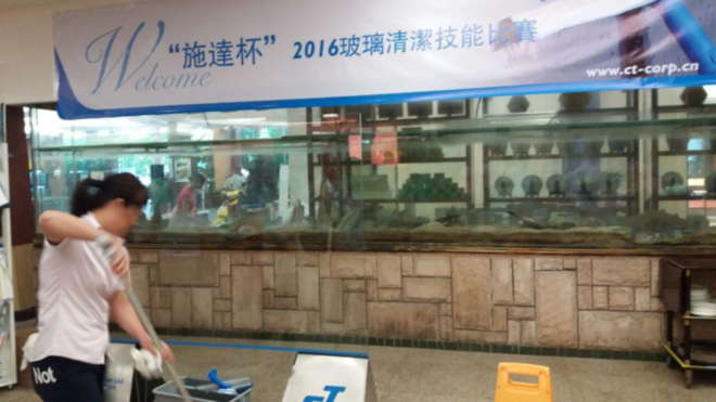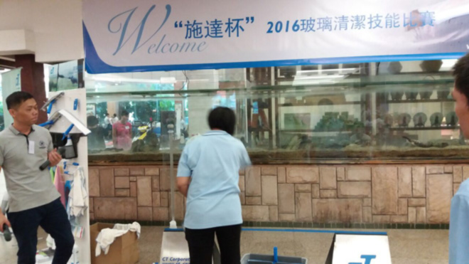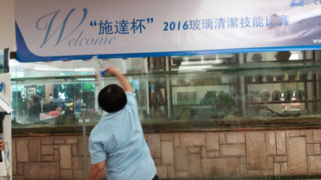 其中由'佛山施达'冠名举办的玻璃清洁技能大赛进行的如火如荼,佛山地区十多家资深清洁企业派遣行业精英参与竞技,比赛现场竞争激烈,比赛所用工具由佛山施达提供,其中最主要的玻璃刮是施达最新产品2合1双面玻璃刮, 使用该玻璃刮能大大减少选手操作时间而提高效率,经过一个多小时的角逐最终产生前三优秀人员。