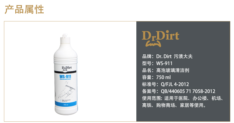 DrDirt高泡浓缩玻璃水属中性配方,不损伤物体表面,用后无需过水。适用于家私、地板、铝门窗、瓷砖、皮鞋、汽车车身等的清洁。DrDirt高泡浓缩玻璃水集清洁和消毒为一体,含有高效抗菌剂,能有效杀灭及抑制各种微生物,清洁力强劲,是工作场所及家居必不可少的清洁消毒剂。