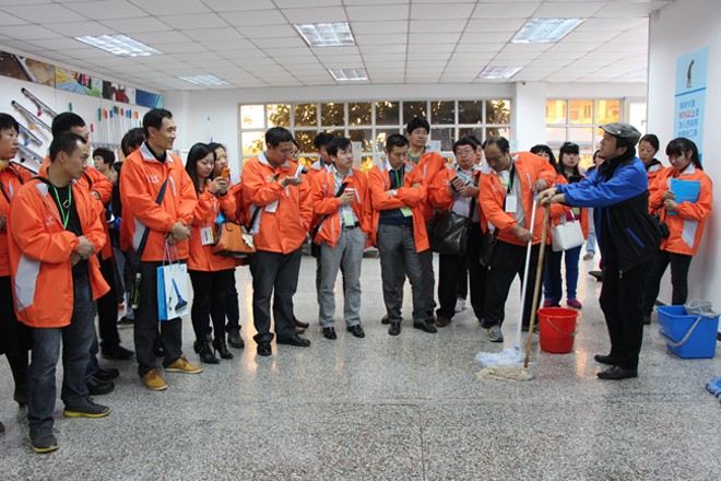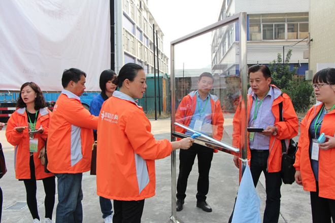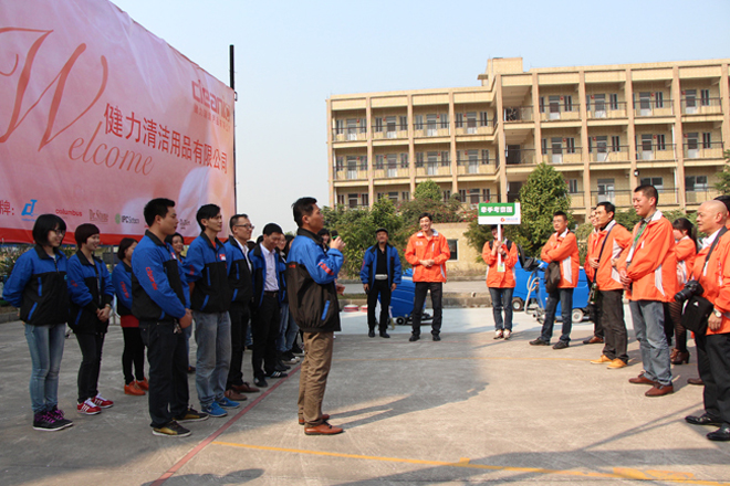 “百人买家团”于下午2点抵达我司佛山健力清洁用品有限公司,由产品培训师朱老师介绍当天的活动流程