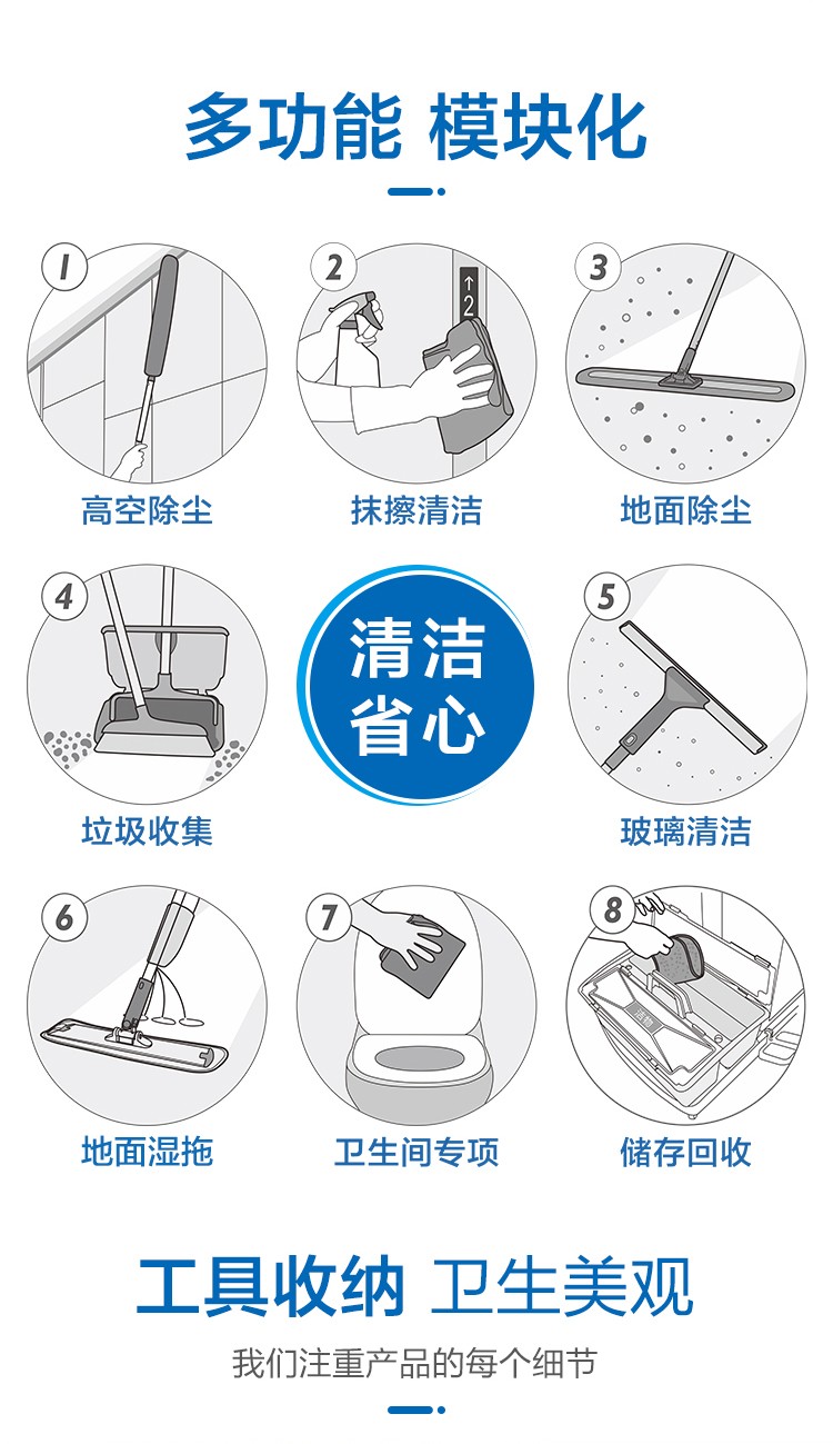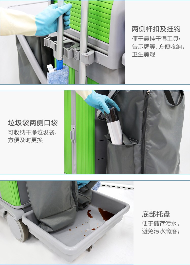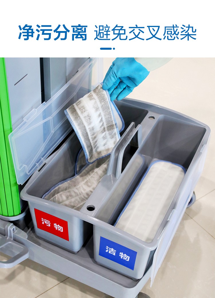 高感控无污水平拖系统清洁服务车,无污水系统设计,可避免清洁过程中的二次感染,无污水喷水拖把,可保证使每次用的清洁剂量统一,保持清洁效果一致,一拖即净一拖即干,避免污水堆积。