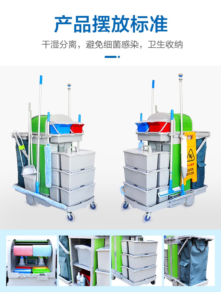 高感控无污水平拖系统清洁服务车,配置分色分区清洁管理系统指示图卡,清洁分色管理就是为具体作业或区域指定使用固定颜色的工具,帮助操作人员立即选择适当的工具清洁不同的区域,绝不允许不同区域混合使用一套清洁工具,避免细菌通过清洁工具交叉感染。