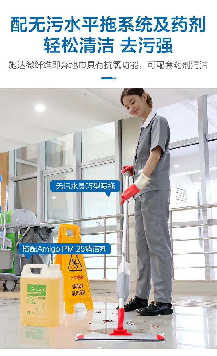 若配套无污水平拖系统及药剂产品使用,能轻松清洁,去污力强。