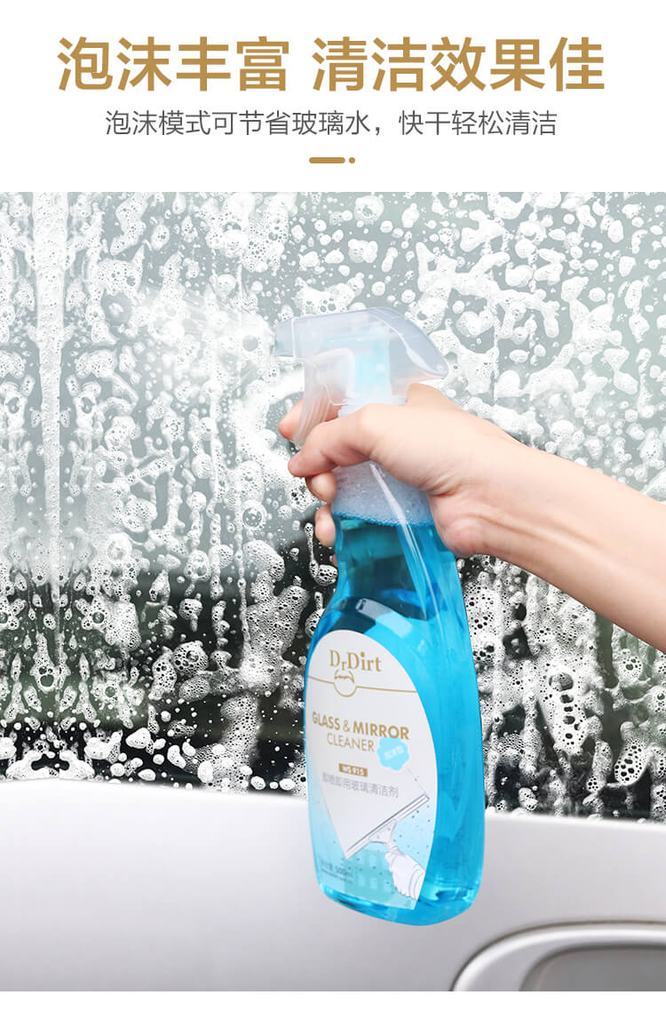 DrDirt即喷即用高效玻璃清洁剂采用水基清洗剂极优异的原料,在清洗速度、环保、安全、高效有极佳表现力。表面活性剂是一种独特的、低起泡、高去污力的活性氧化胺,不存在易燃溶剂。