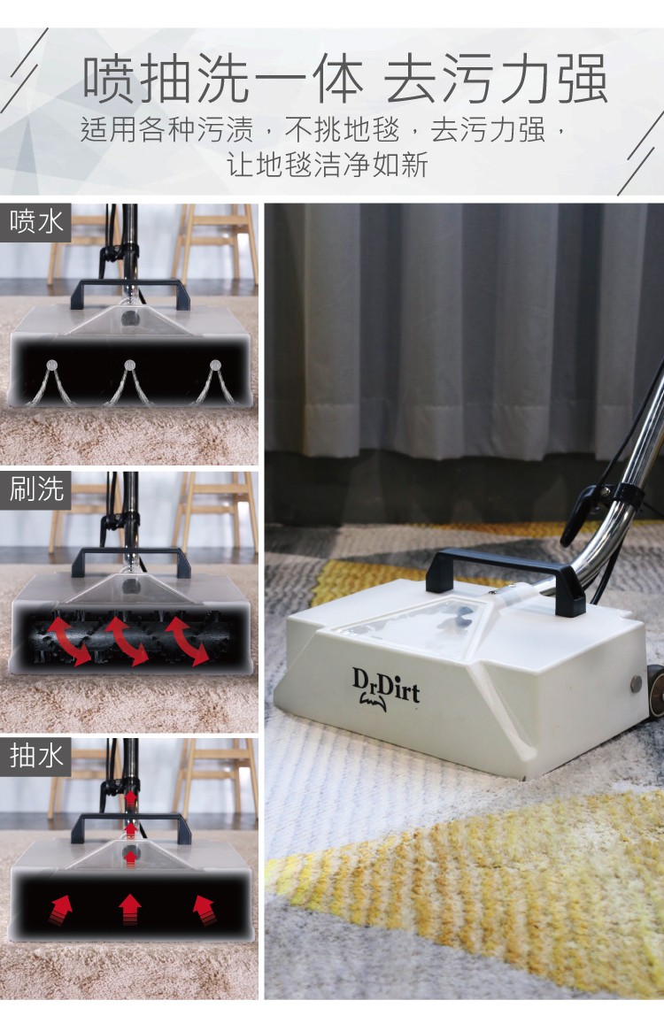 1、先用普通扫把或吸尘器将头发等明显垃圾处理一下,再用电动地毯抽洗机就拖得很干净了。