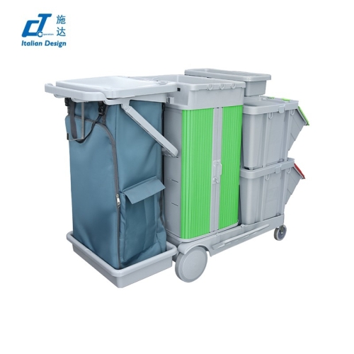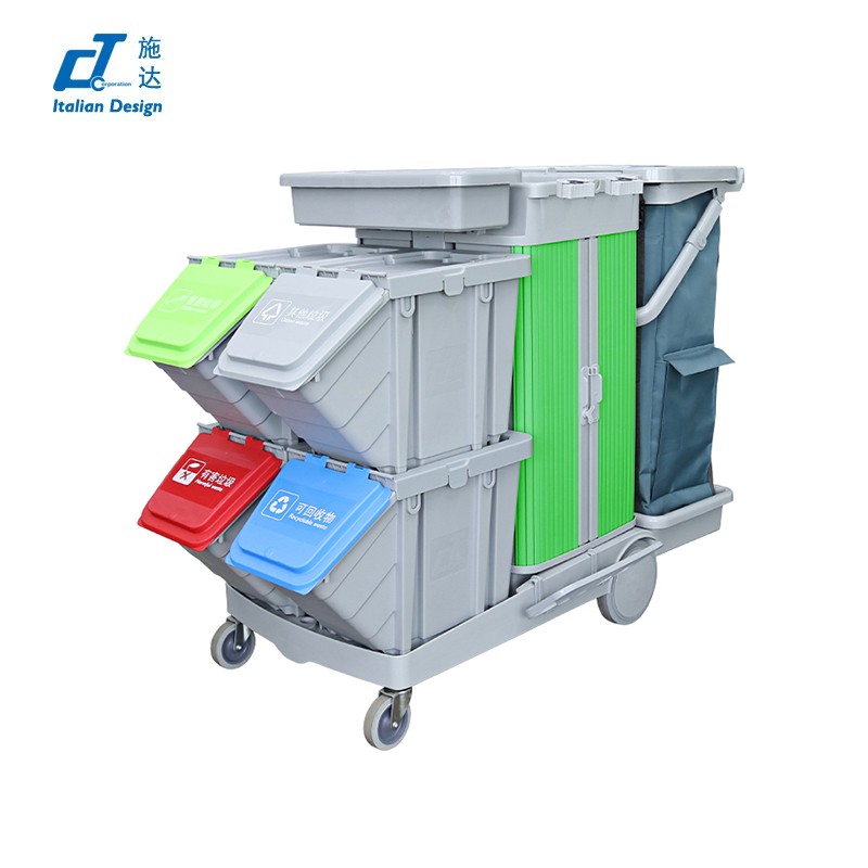 CT施达 清洁服务手推车带绿色趟门大箱 配垃圾袋、4个25公升分类箱